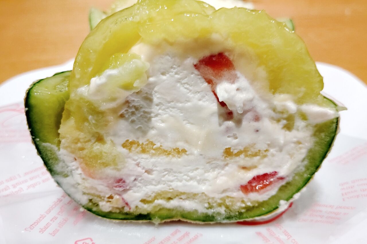 メロンの器に入っていて、果汁たっぷりな完熟メロンを贅沢に使ったケーキ。
