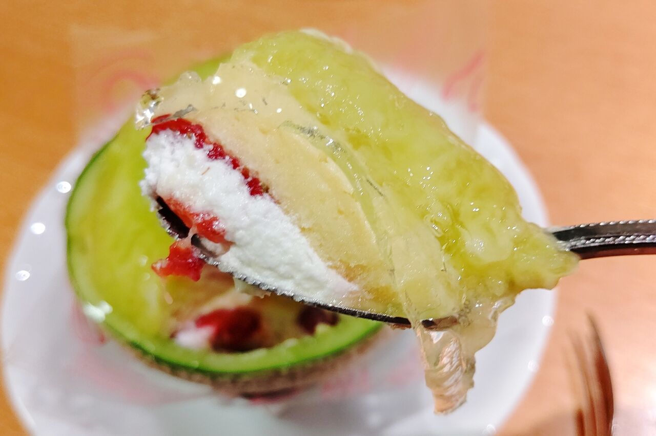 外はジューシーなメロン、中はソフトで舌触りの良いケーキ。メロンについているゼリー?ジュレ?も美味しい。